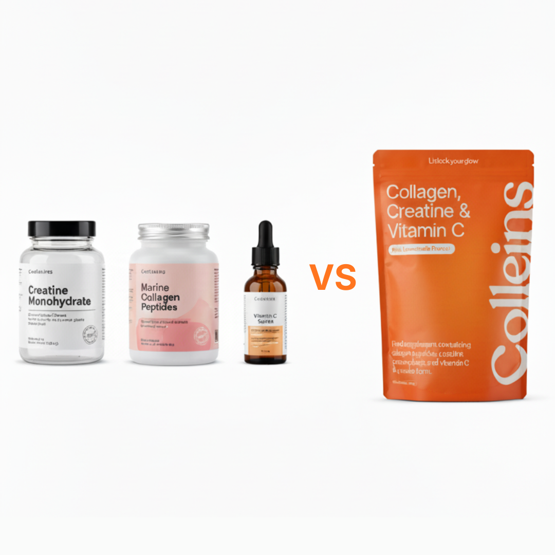 Samenvatting: Veel vrouwen nemen dagelijks meerdere supplementen apart: creatine, collageen, vitamine C. Drie potjes, drie prijzen, drie keer per dag eraan denken. Colleins combineert ze in één scoop.