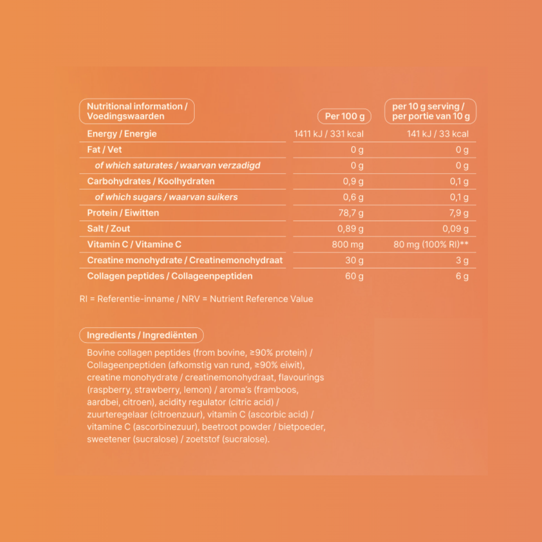 Collageenpeptiden (afkomstig van rund), creatinemonohydraat, aroma's (framboos, aardbei, citroen), zuurteregelaar (citroenzuur), vitamine C (ascorbinezuur), verdikkingsmiddel (xanthaangom), bietpoeder, zoetstof (sucralose).